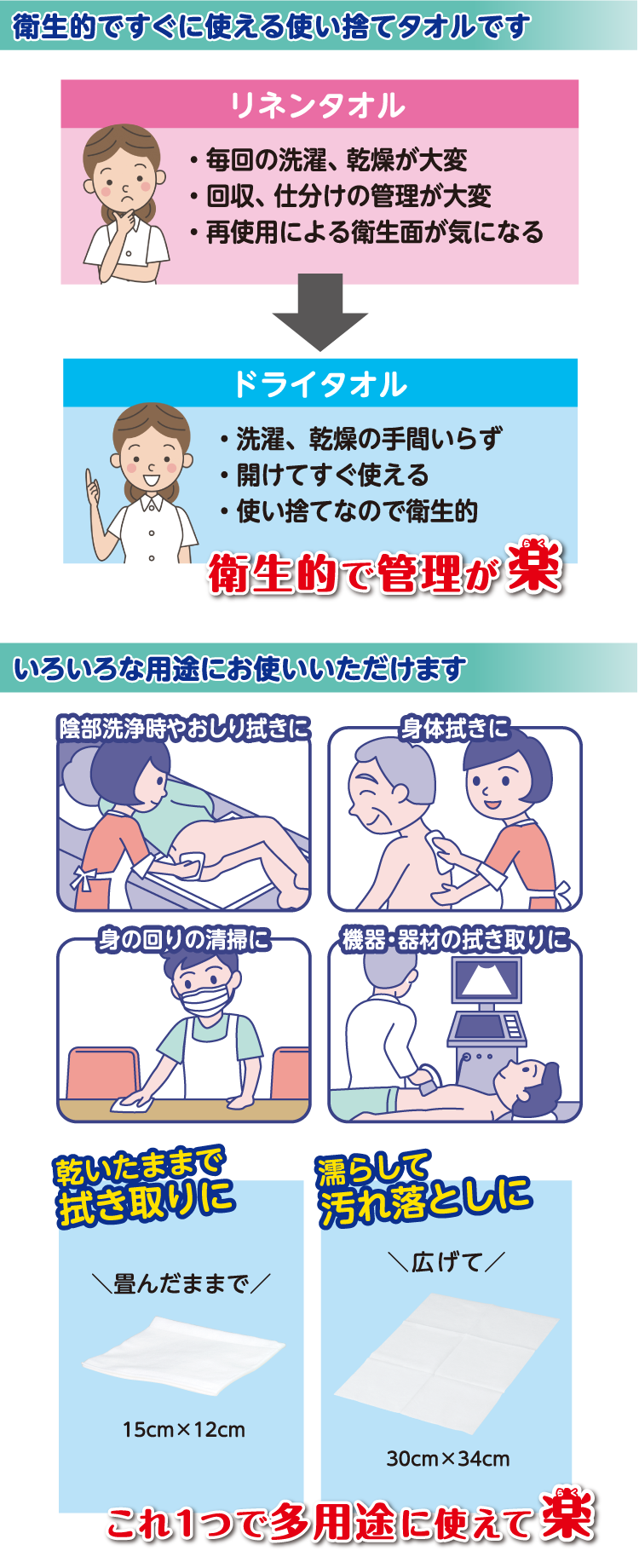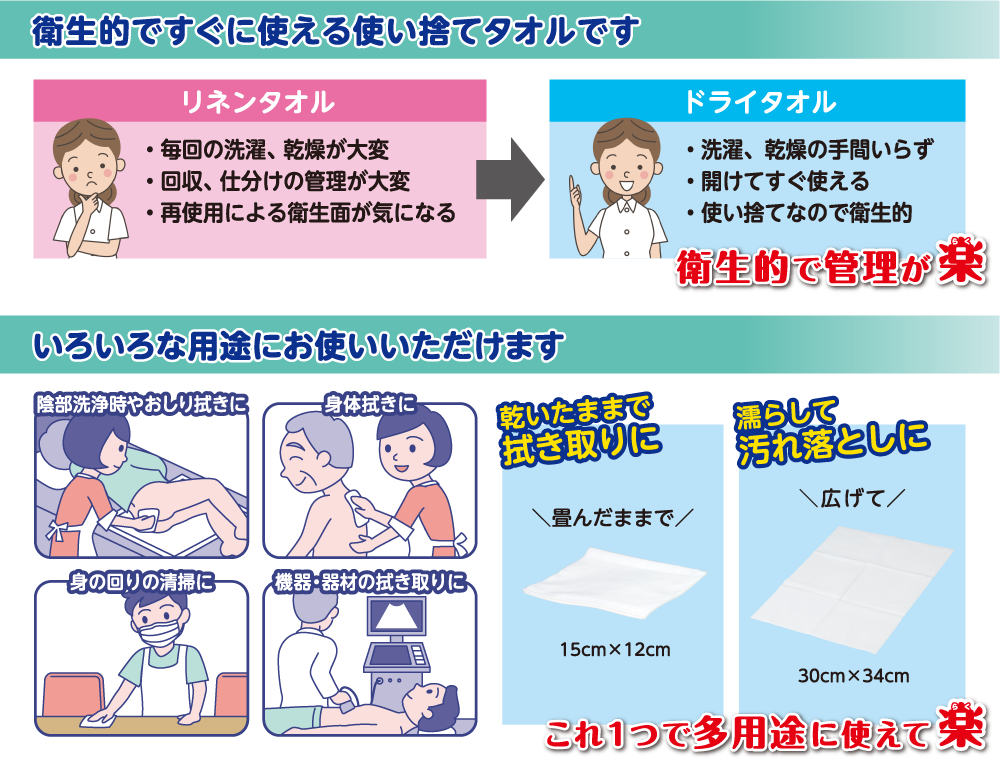 • 乾いた状態でも、お湯や清拭剤、薬液などで濡らしても使用できます。
